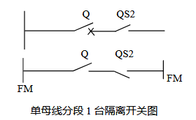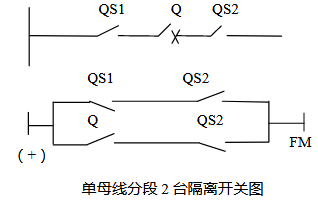 在單母線分段型母線上的線路包括2組隔離開關(guān)及1組斷路器。模擬操作中,此模擬開關(guān)的機械變位信號經(jīng)邏輯判斷:如為正常操作,送電時,依次閉合電源側(cè)隔離開關(guān)QS1、負荷側(cè)隔離刀QS2和斷路器Q;停電時,斷路器Q、電源側(cè)隔離刀QS1、分負荷側(cè)隔離刀QS2。其輸出部分保持低電位不變,不會啟動報警系統(tǒng);凡不符合上述操作順序的任何操作均屬錯誤操作,其輸出部分FM由低電位變?yōu)楦唠娢唬?),啟動報警回路動作,發(fā)出聲光信號提示操作者。